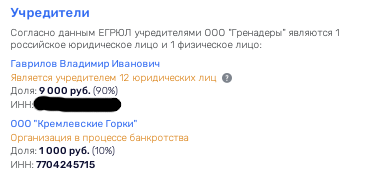 А с некоторыми, например с компанией "Гренадеры" у фирмы, в том числе через "дочек", были финансовые отношения. Или, к примеру, с ООО "Рибмон" "Продинторг" связан через ООО "Каскад", которое было им продано Никите Нефедову - директору "Рибмона". Последнее в свою очередь принадлежит ООО "Гренадеры" совместно с Владимиром Гавриловым. Последний - ветеран войны в Анголе и ранее фигурировал в позднее удаленной статье "Ведомостей" о переходе в аренду около 1000 га лесных участков, выделенных ещё при губернаторстве Громова.