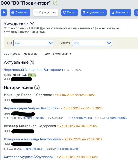 С 2022 года ООО "Внешнеэкономическое объединение "Продинторг" принадлежит некоему Станиславу Чернявскому, никаких других активов не имеющему. Возможно, новый собственник чей-то номинал?