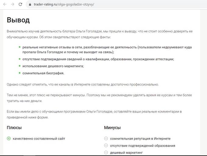 Особенно подчеркивается, что весь позитив – явно заказной. А вот негативные отзывы – явно реальны. И они говорят далеко не в пользу Ольги Гогаладзе.