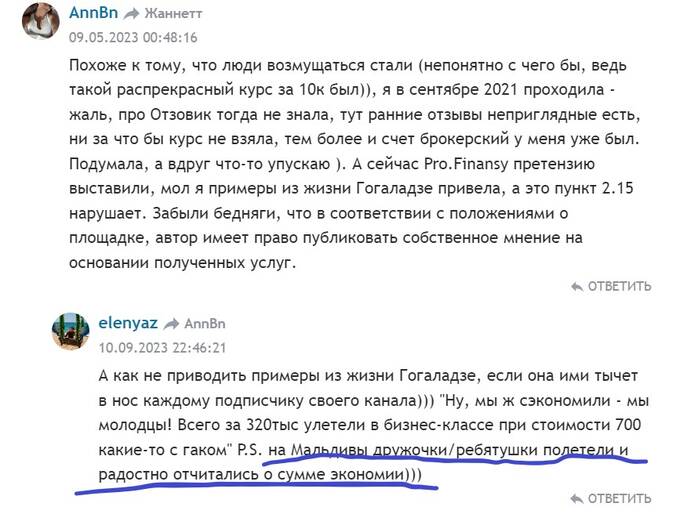 Собственно, для тех, кто хоть немного дружит с мозгами, такой результат неудивителен – достаточно хотя бы бегло ознакомиться с теми «гениальными» советами, которые дает Гогаладзе в сфере инвестиций и заработка денег, чтобы с ней не связываться. Но умные люди и не связываются. Ее контент рассчитан на тупых инстакуриц, полагающих, что деньги можно заработать «позитивным мышлением» и «правильными посылами мировому эфиру».