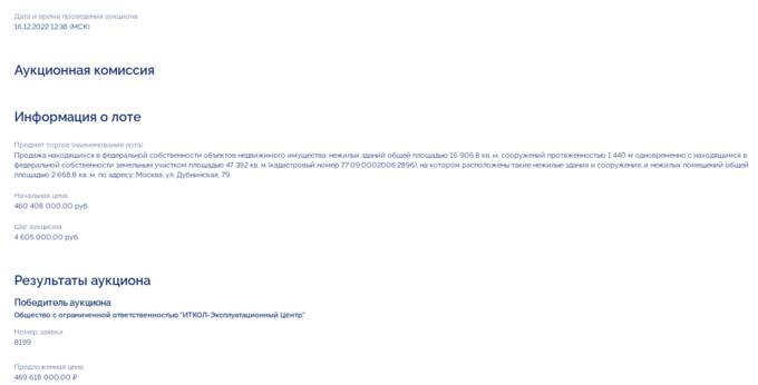 Тут важно отметить, что, несмотря на маленький уставный капитал и убыток в 16 млн рублей по итогам 2022 года, компания "Иткол - эксплуатационный центр" представляет интерес прежде всего своими земельными активами. В декабре 2022 года именно эта фирма с торгов за 469 млн рублей приобрела через площадку "Дом.РФ" федеральные активы на ул. Дубнинская, 79. Речь шла в числе прочего и о земельном участке площадью 47 392 кв. м.