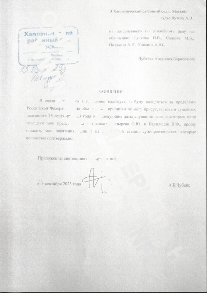 - суд приобщает к материалам дела некую бумажку якобы подписанную Анатолием Чубайсом, о невозможности его явки в суд по объективным причинам, известные только ему одному. При этом есть все основания полагать, что данное заявление подписано не самим Анатолием Чубайсом, а третьим лицом, без заверения нотариусом или консулом и без апостиля;