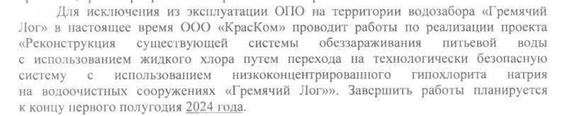 Тогда же выяснилось, что «Краском» проводит реконструкцию существующей системы обеззараживания питьевой воды с использованием жидкого хлора путём перехода на технологически безопасную систему с использованием низкоконцентрированного гипохлорита натрия на водоочистных сооружениях водозабора.