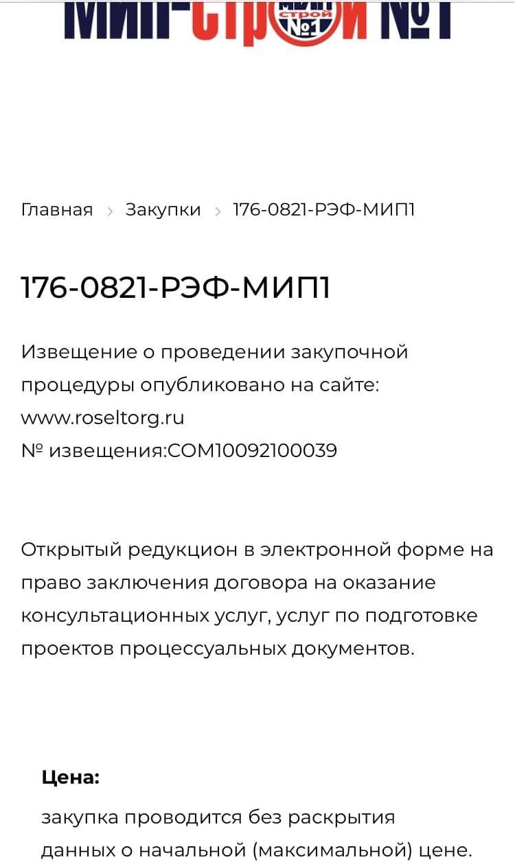 Далее - проведенная днем позже закупочная процедура (редукцион) N 176-0821 РЭФ-МИП 1 на право заключения договора на оказание консультационных услуг, по подготовке процессуальных документов.