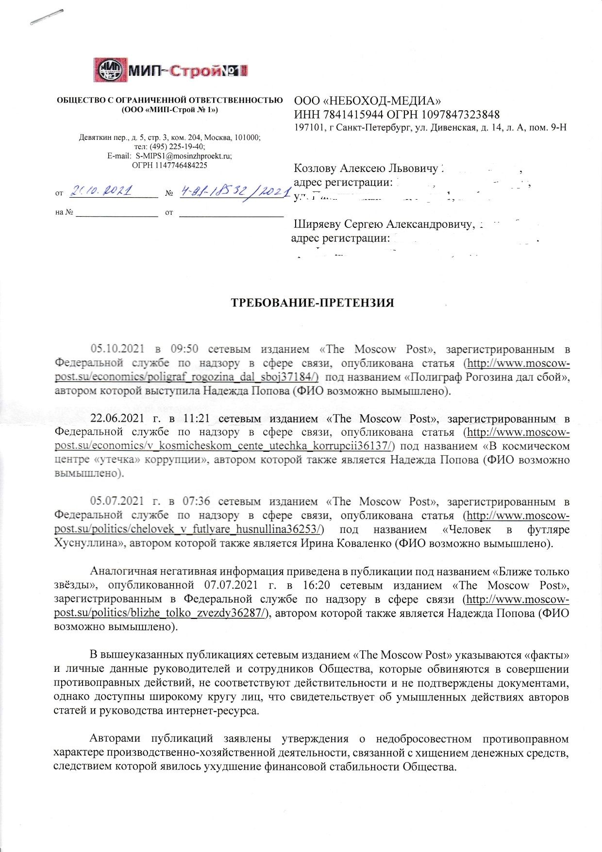 Пока готовилась публикация в Редакцию The Moscow Post пришло письмо-претензия от самой ООО "МИП-Строй №1". Сей документ сам в прошлом осужденный директор этой компании г-н Маслаков-Григорьев подписывать не стал. Правильно. Зачем лишний раз светить свою фамилию, уже попавшую в хронику судебных новостей. За него это сделал его зам. М.В. Васильев. Недовольство компании вызвали прежние публикации The Moscow Post об этой истории, такие как "В космическом центре "утечка" коррупции", "Человек в футляре Хуснуллина" и "Полиграф Рогозина дал сбой". Так вот, этот г-н Васильев утверждает, что "Авторами публикаций заявлены утверждения о недобросовестном противоправном характере производственно-хозяйственной деятельности, связанной с хищением денежных средств, следствием которой явилось ухудшение финансовой стабильности Общества.