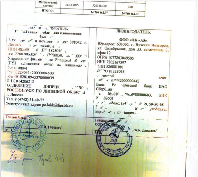 В апреле 2020 года по надуманному поводу уволена главный врач Любовь Викторовна Агафонова - в больнице два врача заразились от пациента новым вирусом COVID-19. Новым главврачом стал Глеб Игоревич Гутевич. Освоившись в кресле, он заключает пять лизинговых контрактов с нижегородской компанией "ЛК "А5" на сумму 67 288 623,12 рублей. Кабала больницы закончится только в 2025 году. Сделки заключены в период с ноября 2021 по январь 2022 года. Почему именно в это время? Липецкий губернатор уже закончил маскировать свои активы.