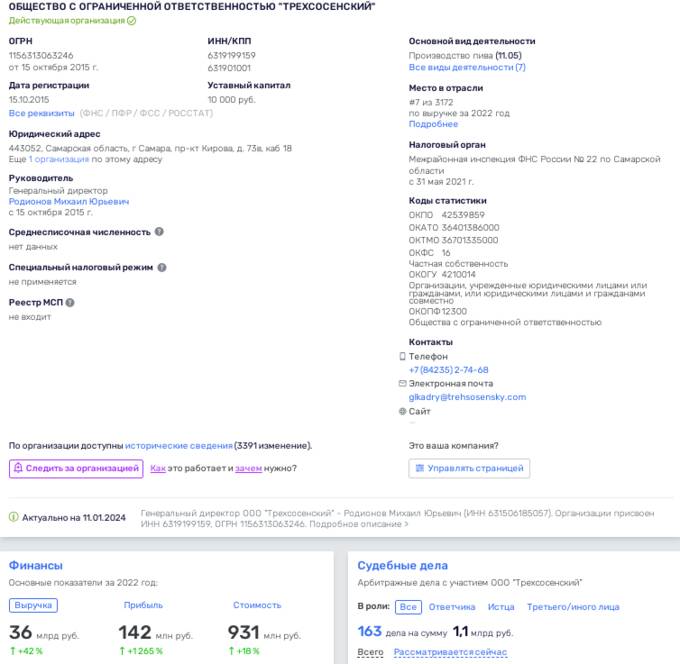 При этом еще в 2015 году в Самаре было учреждено для производства пива некое ООО "Трехсосенский", директором которого является Михаил Родионов. Этот актив в отличие от первого прибылен: в 2022 году он получил выручку на 36 млрд рублей и чистую прибыль на 142 млн рублей.