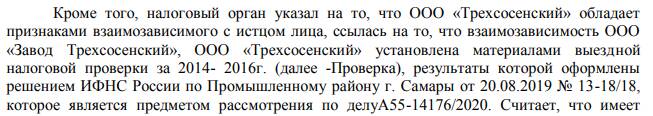 Вот только налоговая не верит во всю эту ловкость рук и в суде на сегодня слушается спор, в котором налоговый орган указал на то, что ООО "Трехсосенский" обладает признаками взаимозависимого с истцом лица и ссылаются они на то, что взаимозависимость установлена материалами выездной налоговой проверки за 2014- 2016 г.