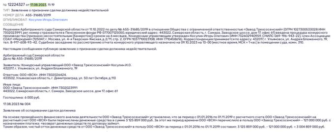 Кроме того, еще в августе 2023 года конкурсный управляющий заявил об оспаривании сделок ООО "Завод Трехсосенский" с ООО "ВСК". Как оказалось, в 2016-2019 годы на счета "ВСК" с банкротящегося предприятия было перечислено более 3,1 млрд рублей. При этом фигурировал там и некий договор займа, но эту строчку потом попытались признать ошибкой бухгалтерии.