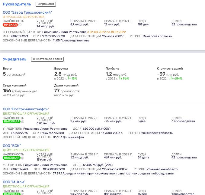 Как мы видим, кое-какие выводы Родионов всё же сделал: теперь он сам не фигурирует в качестве собственника активов, выступая лишь директором, а владельцем пока ещё действующих юрлиц проходит бывший директор пивзавода и его супруга - Лилия Родионова. Например, так обстоят дела с нефтедобывающим ООО "Востокинвестнефть" и рядом компаний из сферы аренды и лизинга транспортных средств, что за 2022 год принесли семейству выручки на 2,8 млрд рублей и чистой прибыли на 1,2 млрд рублей, пока пивзавод тонет в долгах. Но тут есть один нюанс - г-жа Родионова также в 2022 году была гендиректором ООО "Завод Трехсосенский". Вот только почему-то к субсидиарной ответственности её никто не привлек. Может уже пора, пока есть из чего налоги в бюджет возвращать и не всё потерялось на Сейшелах?