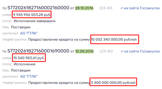 Чтобы прояснить ситуацию в банке, когда им руководил Константин Церазов и его подельники, надо посмотреть на компании, которые получали от «Открытия» деньги. В 2016 г. были заключены договоры на предоставление кредитов государственной ГТЛК. При этом суммы отличаются от тех, которые указаны в предмете договоров.