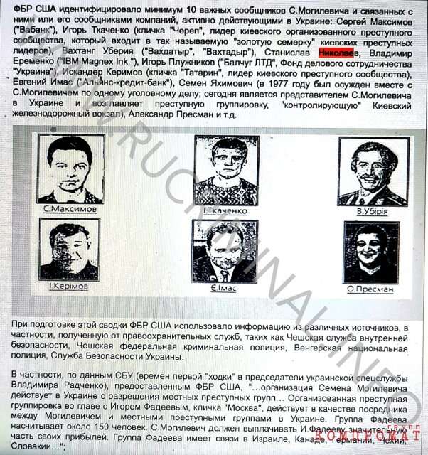 «ФБР США идентифицировало минимум 10 важных сообщников С.Могилевича и связанных с ними или его сообщниками компаний, активно действующими в Украине: Сергей Максимов ("Вабанк"), Игорь Ткаченко (кличка "Череп", лидер киевского организованного преступного сообщества, который входит в так называемую "золотую семерку" киевских преступных лидеров), Вахтанг Уберия ("Вахдатыр", "Вахтадыр"), Станислав Николаев, Владимир Еременко ("IBM Magnex Ink."), Игорь Плужников ("Балчуг ЛТД", Фонд делового сотрудничества "Украина"), Искандер Керимов (кличка "Татарин", лидер киевского преступного сообщества), Евгений Имас ("Альянс-кредит-банк"), Семен Яхимович (в 1977 году был осужден вместе с С.Могилевичем по одному уголовному делу; сегодня является представителем С.Могилевича в Украине и возглавляет преступную группировку, "контролирующую" Киевский железнодорожный вокзал), Александр Пресман.