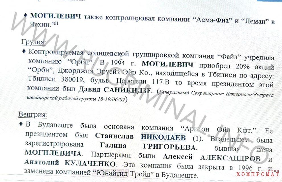 Контролируемая солнцевской группировкой компания “Файл” учредила компанию “Орби”. В 1994 г. МОГИЛЕВИЧ приобрел 20% акций “Орби”, Джорджия Эруейз Эйр Ко., находящейся в Тбилиси по адресу: Тбилиси 380019, бульв. Церетели 117.В то время президентом этой компании был Давид САНИКИДЗЕ. (Генеральный Секретариат Интерпола/Встреча швейцарской рабочей группы 18-19/06/02)