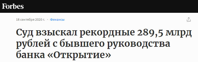 Напомним, три с половиной года назад банком «Финансовая корпорация «Открытие» был подан иск на сумму 289,5 миллиардов рублей по отношению к экс-владельцам и топовым руководителям.