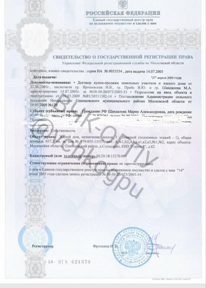 • Свидетельство о праве на дом площадью 657 кв.м. в элитном поселке Горки-8 (оценочной стоимостью в 4 млн. долл.).