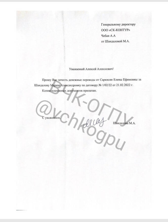 • Документ о переводе платежей от Саркисян Елены Ефимовны (предположительно мать Шандаловой Марии) на Шандалову Марию Александровну. Несмотря на то, что за Андреем Шандаловым охотятся кредиторы ИТ-компании ОПТИМА на сумму 8 млрд. руб. и 35 млн. долл. долг перед Газпромбанком он имеет кредитную карту и счет в Сбербанке.