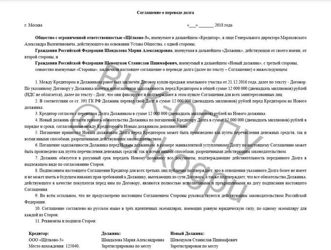 • Договор купли-продажи земельного участка Марией Шандаловой в Щелково – 3 на сумму 12 млн. руб.,