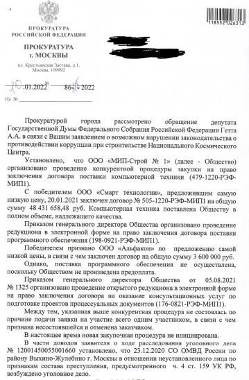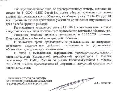 В распоряжении The Moscow Post есть документы, в которых речь идёт о случаях воровства в компании. Согласно тексту документа, ещё 23 октября 2020 года в отношении неустановленного лица возбуждено уголовное дело по статье "Мошенничество". Неустановленные лица, находясь на складе №8 "МИП-Строй №1", похитили имущество компании стоимостью 2,7 млн рублей.