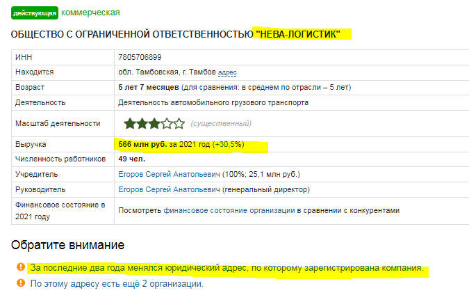 3. ООО «Нева-логистик». Сначала эта компания состояла на учете в Питере, теперь организация также перебазировалась в Тамбов.