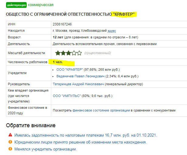 ООО «Крафтер» имеет уставной капитал в размере 275 миллионов рублей, но при этом отметим, что почти 98% статусного фонда на данный момент принадлежит самому обществу. Кроме того, в самом штате числится всего лишь один человек. Также, по состоянию на 01.10.2021, у компании была задолженность по налоговым платежам на сумму 16,7 миллионов рублей.