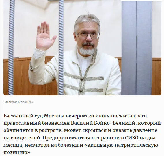 О том, как арестовали сообщника Волина, еще одного «православного» предпринимателя Бойко-Великого, сообщало в 2019-м году популярное издание «Forbes». Тогда Басманный суд столицы решил, что этот персонаж, которого обвиняли в растрате, может сбежать и надавить на свидетелей, поэтому Бойко-Великого отправили в СИЗО на несколько месяцев.