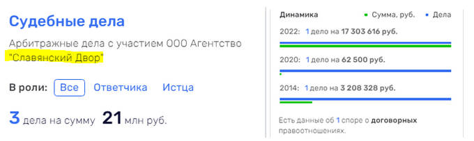 По данным сервиса «Rusprofile», это агентство числится в 3 судебных делах на общую сумму в 21 миллион рублей. Также имеются данные о споре касательно договорных правоотношений.
