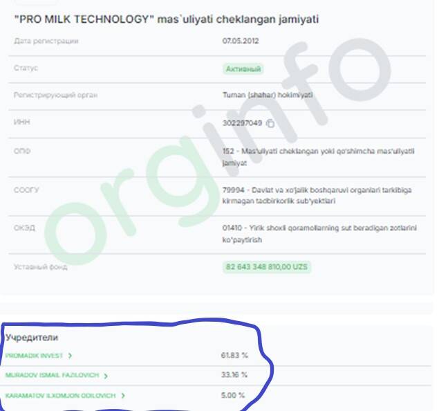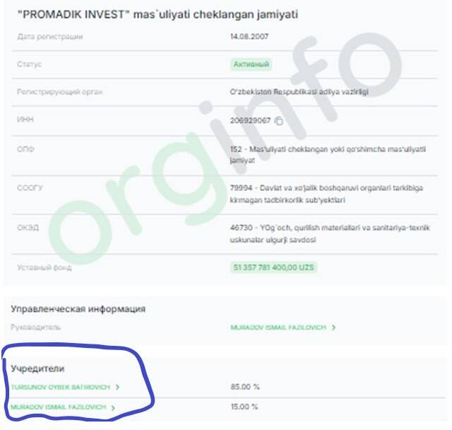 Promadik Invest – компания, зарегистрированная в 2007 году. Уставный фонд – 399 млн сумов (о ней было выше). Основной деятельностью указаны аренда и лизинг сельскохозяйственной техники и оборудования. 95% акций компании принадлежали Турсунову Ойбеку Батыровичу, остальные 5% - Мурадову Исмаилу Фазиловичу, указанному как руководитель компании.