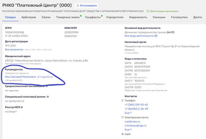 По данным Руспрофайла, руководителем РНКО «Платежный Центр» является Мац Григорий Моисеевич, а зарегистрирован он в Новосибирске.