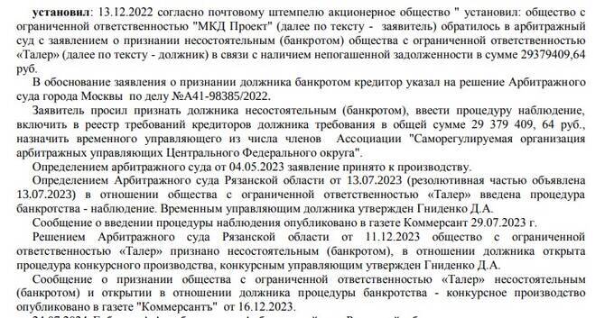 Вот, к примеру, тот же Талер банкротило некое ООО «МКД Проект» и долг-то был не особо крупным - около 29 млн рублей.
