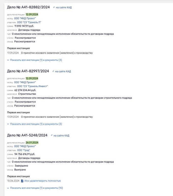 ООО «МКД Проект» также имеет претензии к ООО «СЗ «Гранель Инвест» (еще одна «дочка» Ильинского) - на 62 млн рублей, к ООО «Специализированный застройщик «Гранель Град», застройщику ЖК «Профит», что слили по знакомой схеме и переименовали в ООО «Град» - 94,7 млн рублей. Были у МКД Проекта и к Талеру, Лэнд-Югу, Дубровке-1.