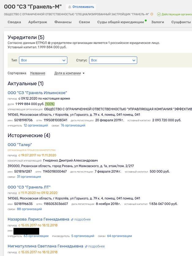 Итак, ООО «Специализированный застройщик «Гранель-М», созданное в 2017 году, принадлежит с 2020 года ООО «Специализированный застройщик «Гранель Ильинское», в конце цепочки владения которым стоит Ильшат Нигматуллин.