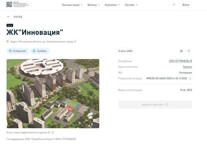 СЗ «Гранель-М» выступало застройщиком ЖК «Инновация», что строили в рп. Новоивановское Московской области. При этом, по данным Минстроя РФ, из шести объектов проекта один был сдан с задержкой сроков строительства.