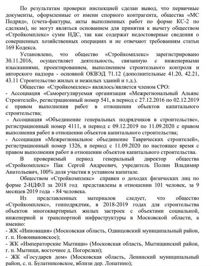 Более того, одна из фирм Полина - ООО «Стройкомплекс» была засвечена в налоговом схематозе, который обнаружили в УФНС. Речь шла о попытке существенно завысить налоговый вычет (485 млн рублей), используя схему с аффилированными фирмами, которые, по мнению налоговиков, никак не могли выполнять работы, так как не имеют соответствующей возможности. При этом в материалах суда упоминалось, что ООО «Стройкомплекс» было генподрядчиком именно ЖК «Инновация».