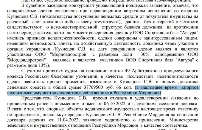 При этом Кузнецов был аффилирован с ООО, которое на тот момент уже имело признаки неплатёжеспособности. Всё выглядело как вывод ликвидного имущества. Так, владельцем 12,5% доли в базе было ООО «МДС» (Мордовдорстрой - крупнейший дорожный подрядчик региона), где 30% принадлежит Кузнецову.