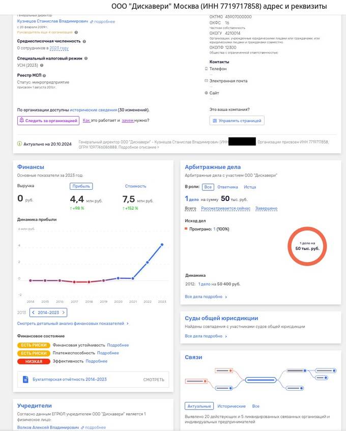 Из числа собственников ООО «Дискавери» вышло лишь в 2019 году, видимо, за не плохие отступные. Ведь выручка фирмы - сотни миллионов рублей (например, за 2023 год - почти 800 млн рублей).