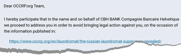 Объектом этой тактики была сама OCCRP. В 2019 году редакторы получили письмо, в котором утверждалось, что длительное расследование, которое показало, что швейцарский банк CBH перевез $277 млн подозрительных средств через подставные компании, принадлежащие российскому миллиардеру Алексею Крапивину, нарушило правила защиты данных ЕС.