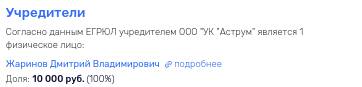 Юридический владелец УК Аструм - Жаринов Дмитрий Владимирович - отнюдь не чужой человек Назаровым. Он - директор московской компании Сакмар, которой владеют жена и сестра премьера - Лариса Назарова и Светлана Нигматуллина. Как показала серия расследований УтроNews, бенефициары Гранели весьма любят припрятать интересы за разного рода доверенными лицами.