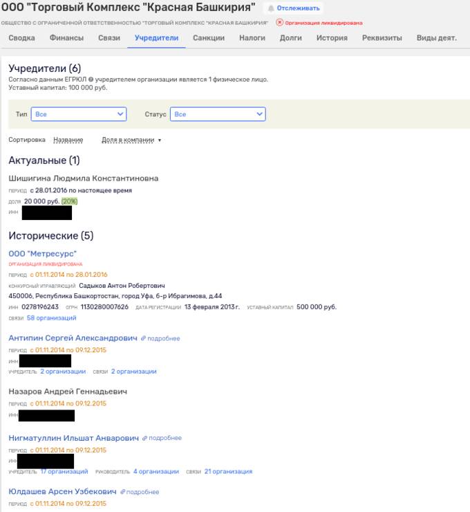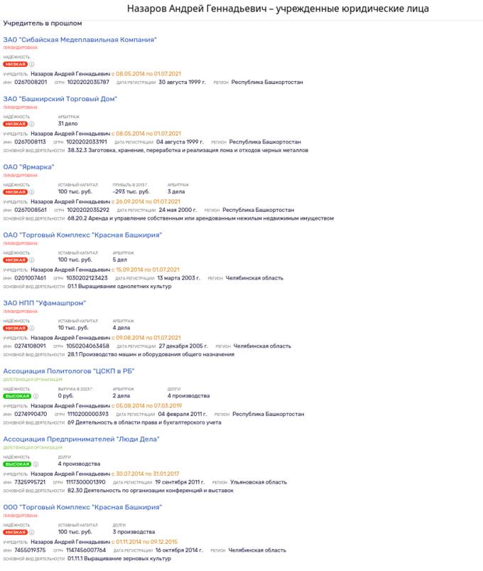 Кстати, сам Назаров ранее владел долей в челябинском ООО «Торговый Комплекс «Красная Башкирия» (выращивание зерновых). Среди совладельцев этой же фирмы отметились Нигматуллин и некий Арсен Юлдашев, который был руководителем МУП УТК «Центральный» в Башкирии.