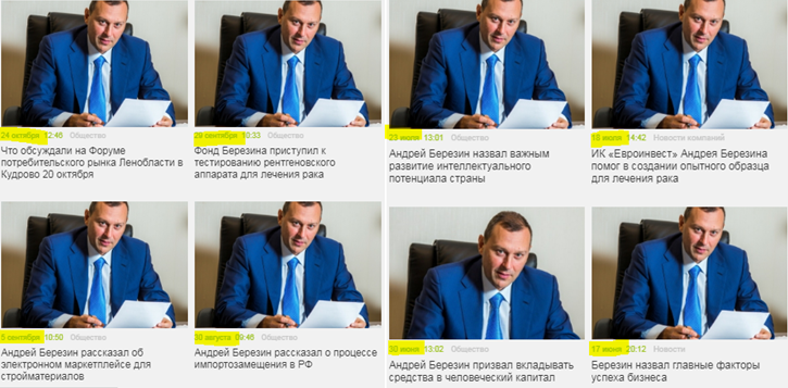 Для этого в каждом релизе, который выпускает организация, всегда «лично присутствует», «принимает участие», «комментирует», «дает интервью» сам Андрей Валерьевич. Но в этой виртуальной афере есть один нюанс – серьезные проблемы с визуализацией. Все дело в том, что в релизах всегда используются архивные снимки Березина.
