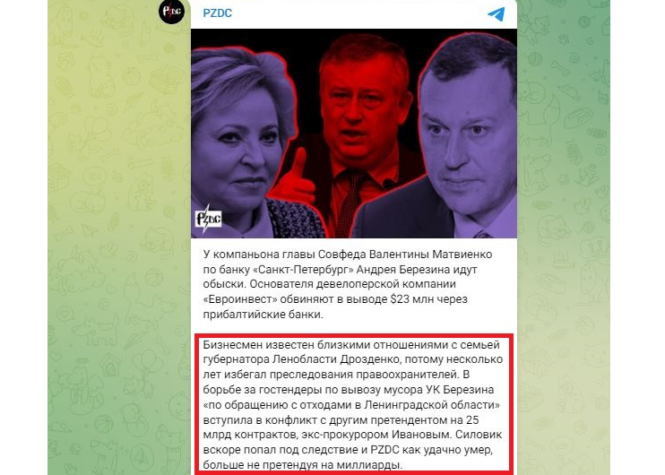 В частности, как сообщали ТГ-каналы, в борьбе за такие «мусорные» тендеры фирма Березина законфликтовала с ещеодним претендентом за госконтракты на сумму в 25 млрд рублей.