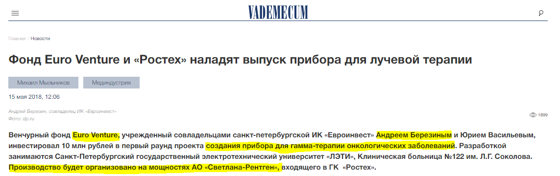 Еще одна тема, на которой искусно «играл» мошенник, не только обогащаясь, но и работая на улучшение своего имиджа, это медицинские новации. В частности, речь идет о новости, которая не так давно всколыхнула российское общество. Мол, в стране может появиться свой прибор для выполнения онкологических операций уникальным методом, делая на коже пациента лишь маленький разрез. Вот здесь как раз и подсуетился предприниматель со своим венчурным фондом «Euro Venture», публично заявив, что готовый на ранней стадии разработки проекта вложить в него 10 миллионов рублей.