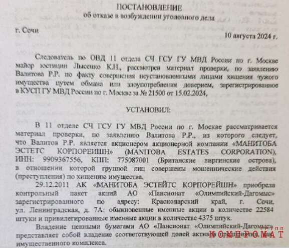 Через свое доверенное лицо Руслана Валитова бенефициар «ManitobaEstatesCorporation» решил добиться признания незаконными итогов сделки 2017 года. Наделенный соответствующими полномочиями Валитов, представляясь акционером виргинского офшора, обратился в силовые структуры с заявлением о якобы совершенном в отношении иностранной компании преступлении: групповом мошенничестве, заключавшемся в хищении имущества АО «Пансионат Олимпийский-Дагомыс».