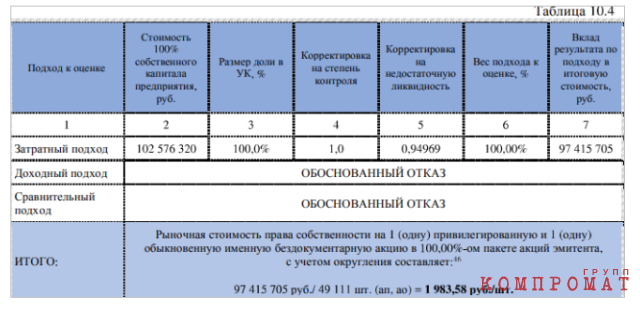Разница, конечно, ощутимая и с какого потолка она взялась в документах следователя Лысенко – большой вопрос. Ведь согласно официальному отчету, подготовленному Торгово-промышленной палатой Краснодарского края (копия имеется в распоряжении редакции «Компромат ГРУПП), по состоянию на 01.10.2016 года, стоимость 100%капитала АО «Пансионат Олимпийский-Дагомыс», составляла 102’576’320 рублей, а одной привилегированной и одной обыкновенной именной бездокументарной акции – 1983,58 рублей.