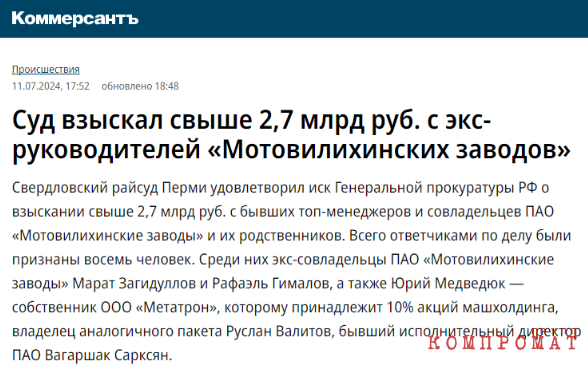 Кстати, летом 2023 года в федеральный розыск объявили Юрия Медведюка, контролировавшего 10% «Мотовилихи» через ООО «Метатрон» и ставшего фигурантом уголовного дела о злоупотреблении полномочиями, повлекшем тяжкие последствия. Однако вскоре стало известно о его допросе без последующего избрания меры пресечения, а в августе 2024 года мировой суд постановил прекратить уголовное производство в отношении экс-акционера «Мотовилихинских заводов», назначив ему судебный штраф в размере мизерных 35 тыс. рублей. Как выяснилось, к этому моменту следствие переквалифицировало обвинение на гораздо менее тяжкую статью об «использовании заведомо подложного документа».