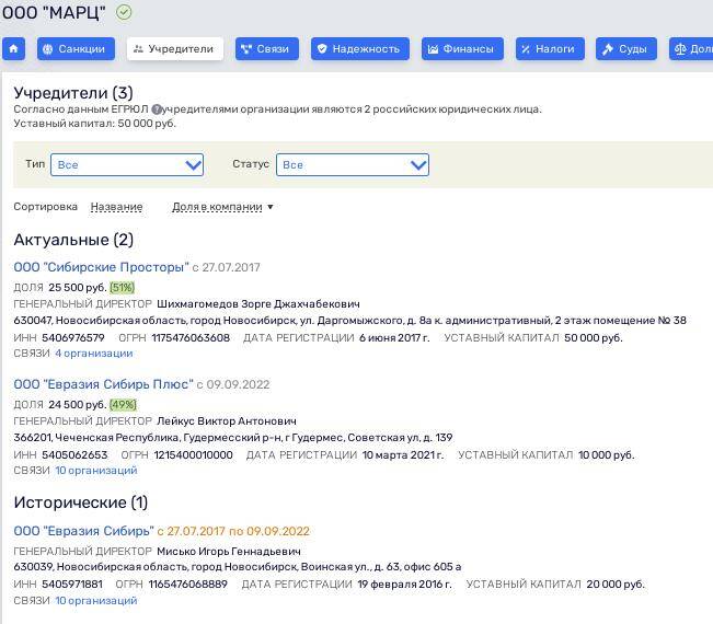 Казалось бы, Таран оборвал юридически связи с Мандарином. Вот только нового владельца МАРЦ - ООО "Евразия Сибирь Плюс" возглавляет его бизнес-партнёр Виктор Лейкус. Он же был совладельцем "Евразия Сибирь Плюс", но с марта 2021 года эта компания юридически принадлежит Ильману Сайханову. Последний владеет в Чечне компанией "Вершина" (посредник на рынке недвижимости) и московской компанией "Столп" из той же сферы. Обе компании демонстрируют весьма и весьма скромные итоги своей деятельности, что может говорить о создании их "про запас".