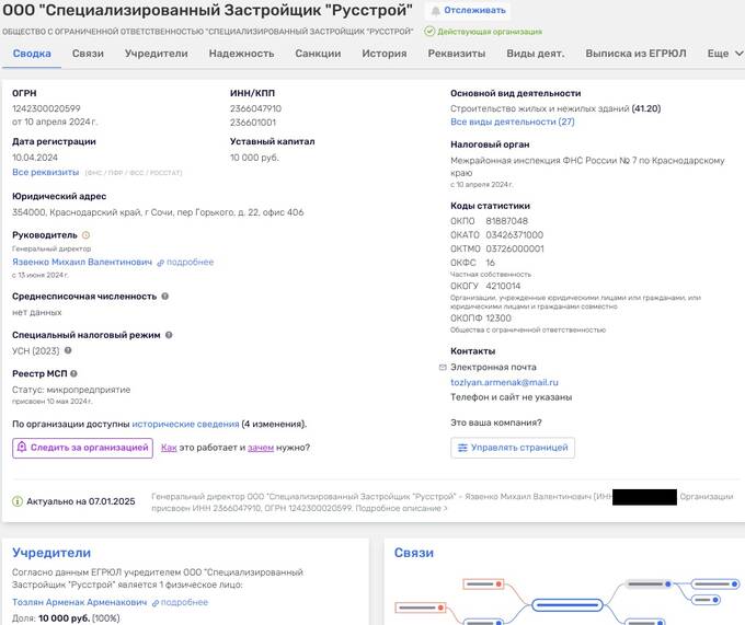 Кстати, буквально за несколько недель до отставки Копайгородского, Тозлян наконец-то вышел из тени и обзавелся и собственной строительной фирмой - ООО «СЗ «Русстрой». Директором в ней с июня 2024 года назначен Михаил Язвенко - полный тёзка бывшего начальника отдела правовой защиты по Центральному району правового департамента администрации Сочи, который в том числе отвечал и за правовые вопросы при подготовке к Олимпиаде. А Тозлян как раз в 2015 году был заместителем гендиректора по перспективному развитию ЗАО «Сетьстрой», что осваивало миллионы на олимпийских стройках Сочи.