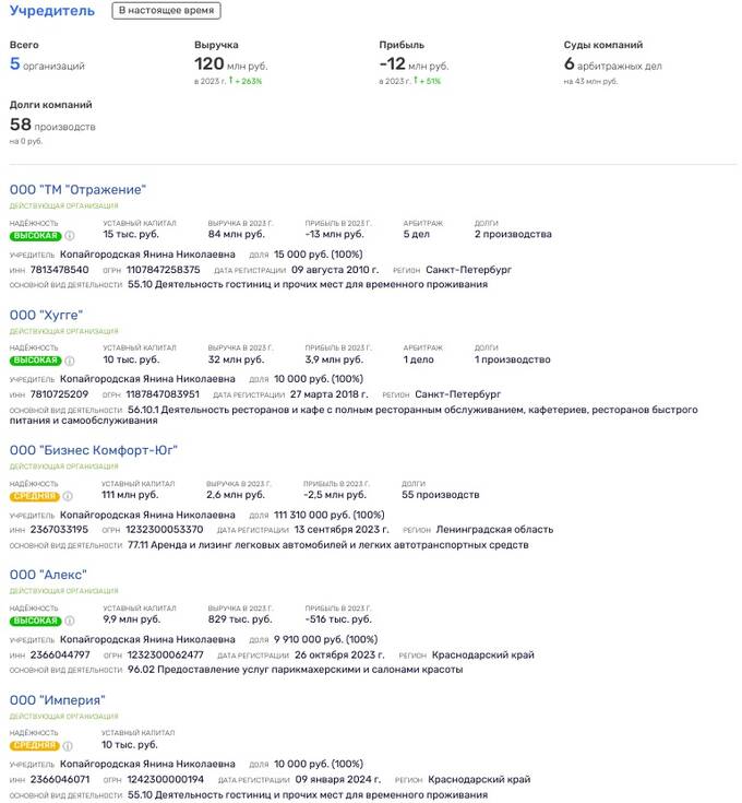 Как УтроNews ранее уже рассказывал, Янина Копайгородская является собственником пяти фирм, в том числе в Сочи, Петербурге и Ленобласти: гостиничном ООО «ТМ «Отражение», ресторанном ООО «Хугге», ООО «Алекс» (парикмахерская), ООО «Бизнес Комфорт-Юг» (аренда и лизинг легковых автомобилей) и гостиничном ООО «Империя» (учреждено в январе 2024 года).