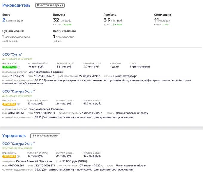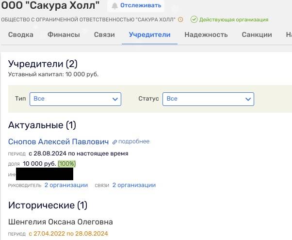 В сентябре 2024 года, то есть незадолго до ареста Копайгородских, в фирме Янины - ООО «Хугге» директором становится некий Алексей Снопов, который тогда же стал директором ООО «Сакура Холл». Последнее в августе 2024 года было оформлено на него.