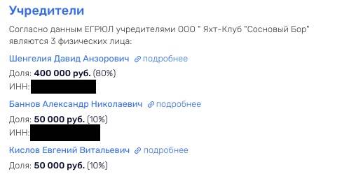 Но самое интересное не это, а то у кого именно было выкуплено ООО «Сакура Холл». Бывшим владельцем была некая Оксана Шенгелия. А вместе с ООО прописано до сих пор и ООО «Яхт-Клуб «Сосновый Бор», среди владельцев которого есть Давид Шенгелия - петербургский предприниматель и брат другого авторитетного бизнесмена Бадри Шенгелии. Последний проходил свидетелем по делу Владимира Кумарина, которого называют ночным губернатором Петербурга, но в 2018 году Шенгелию убили. Кстати, издание 47news, называло Шенгелию самым известным рейдером нулевых на Северо-Западе.