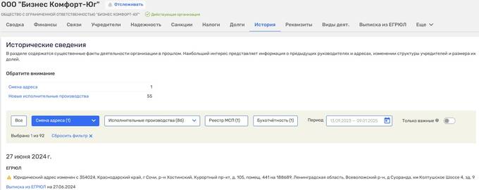 Удивительное совпадение ещё в том, что в 2024 году Копайгородская также сменила прописку одному из своих активов - ООО «Бизнес Комфорт-Юг» - с Сочи на Ленобласть, на некую деревню Суоранда, по адресу, где судя по открытым данным, находятся лишь склады.